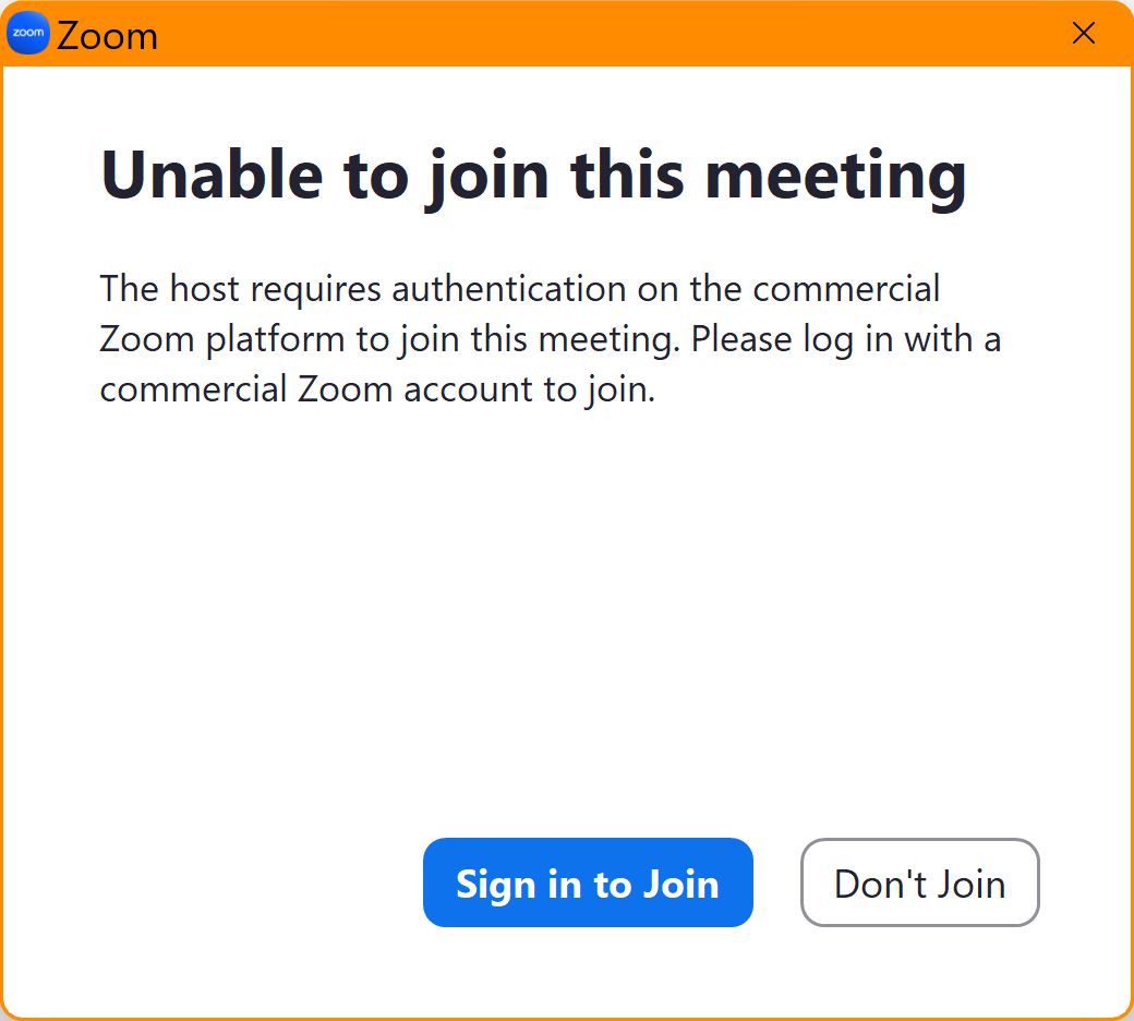 » "The host requires authentication on the commercial Zoom platform to join this meeting. Please log in with a commercial Zoom account to join."