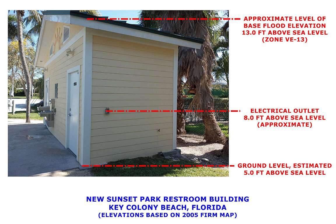 » As the photograph shows, KCB constructed the Sunset Park restrooms below BFE with no provision for storm surge or flood waters. There are no flood vents in the walls. The plumbing and fixtures are not protected from salt water intrusion. The electrical outlets are below BFE.